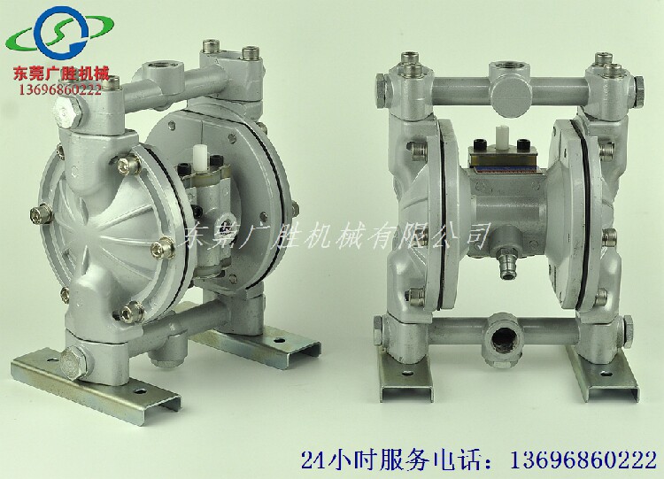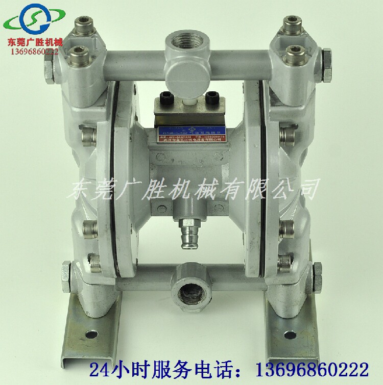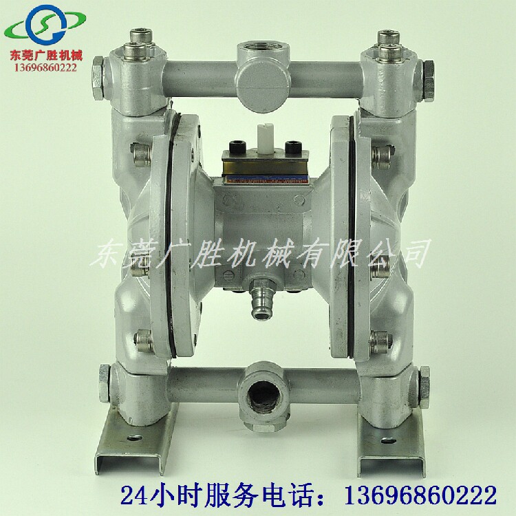 本泵由左右两组隔膜将左右两气室及介质输送腔隔开。当换向阀的阀芯在右边位置时,压缩空气进入左气室,同时右气室内压缩空气排出。随着左气室内压力增大,左边隔膜向左挤压,使左输送腔内压力增大,腔内介质通过单向阀向上输送,由出口排出,右输送腔单向阀关闭。
